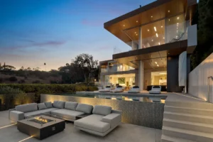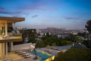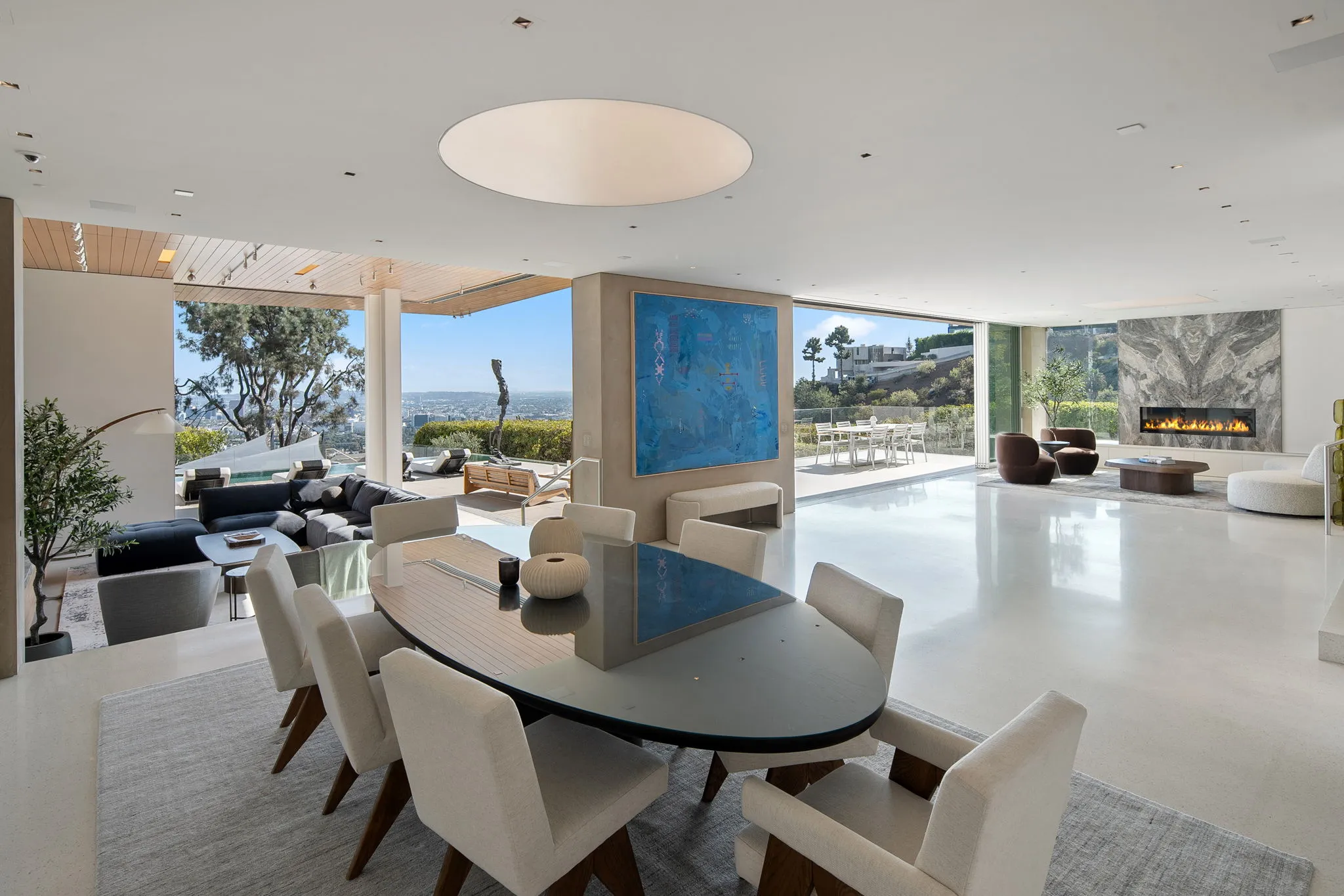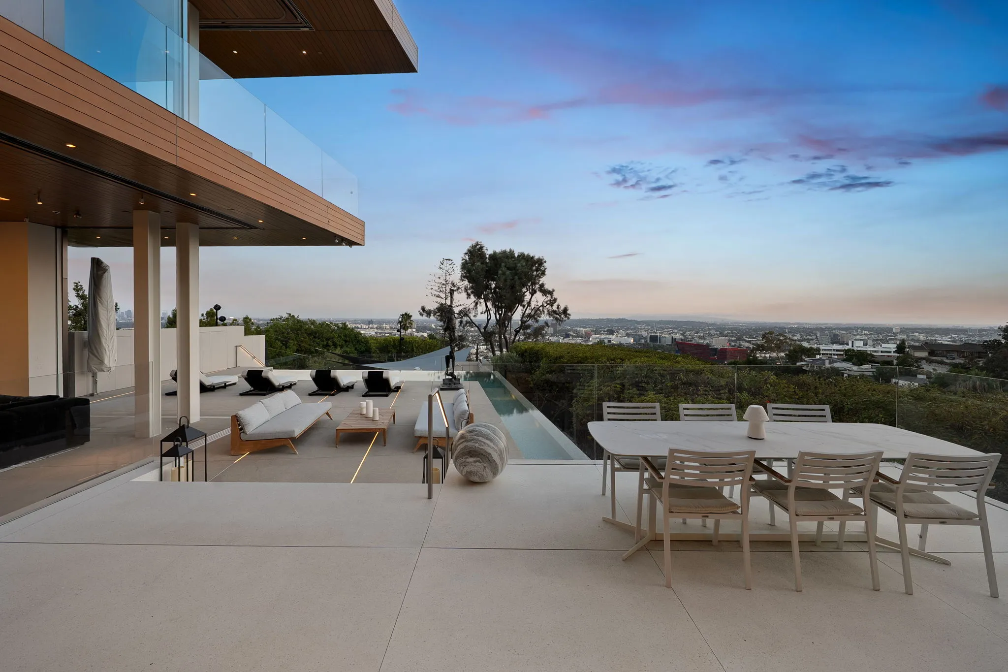 Hailed by Architectural Digest as a "sensational setting," this Sunset Plaza residence masterfully blends the visionary designs of McRitchie Design and Gary Hutton Design. Its striking steel-clad exterior opens to an interior of gallery-like elegance, balancing minimalist sophistication with a warm, inviting ambiance. Crafted to showcase art of any scale, the home features plywood-lined walls for seamless installations, complemented by radiant heated floors, a state-of-the-art security system, an elevator, and advanced smart home technology. Polished terrazzo floors, architectural lighting, and retractable glass walls accentuate both curated artwork and breathtaking views stretching from downtown to the Pacific Ocean. The open-concept layout seamlessly integrates a sleek, modern kitchen with the main living and dining areas, all flowing effortlessly onto an expansive sundeck featuring a custom mosaic-tiled pool and unobstructed vistas. Perched atop the residence, the glass-wrapped primary suite maximizes panoramic views, accompanied by three additional bedrooms, a luxurious media room, and a private outdoor deck. On the lower level, a versatile guest suite with its own bathroom and kitchen opens to a spacious covered deck, perfect for intimate gatherings or grand entertaining.