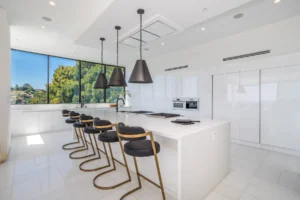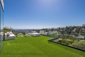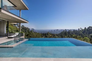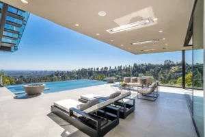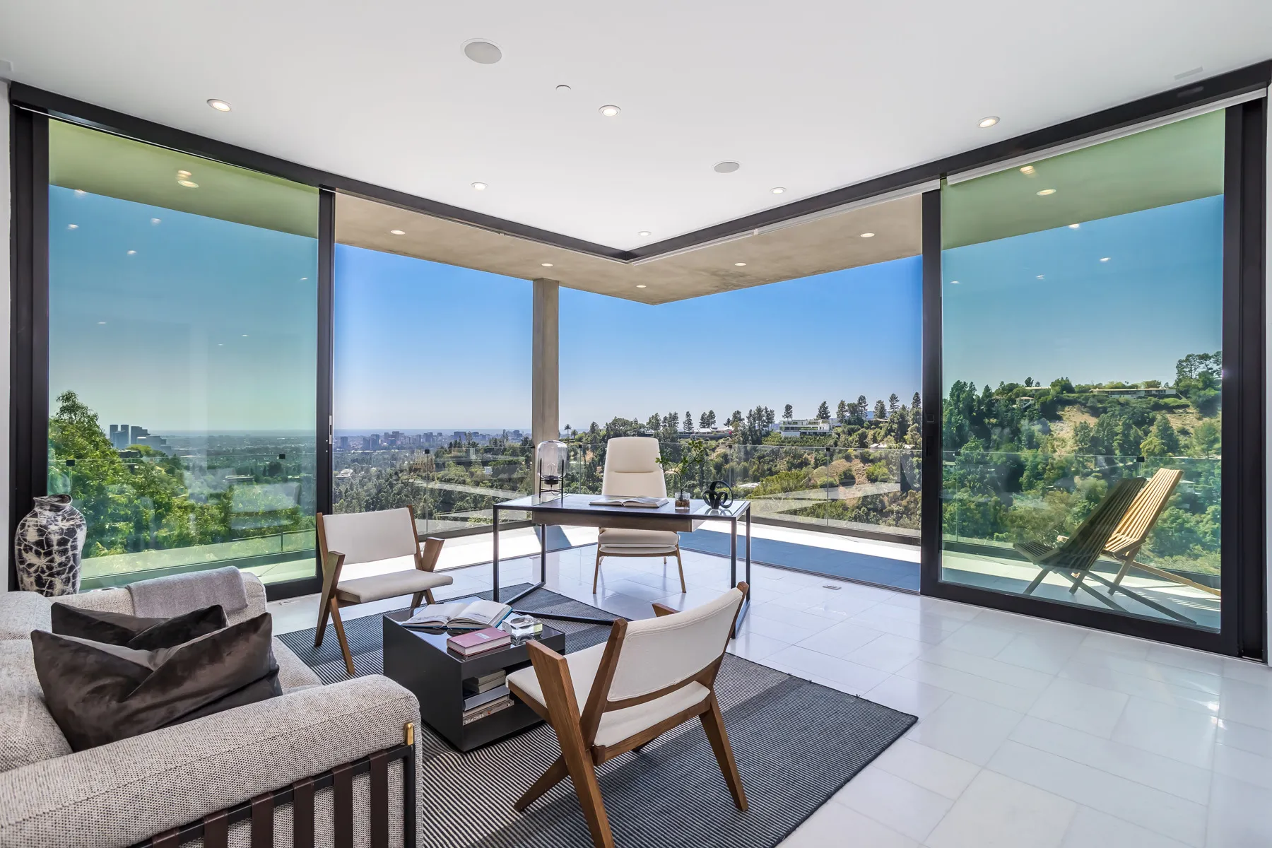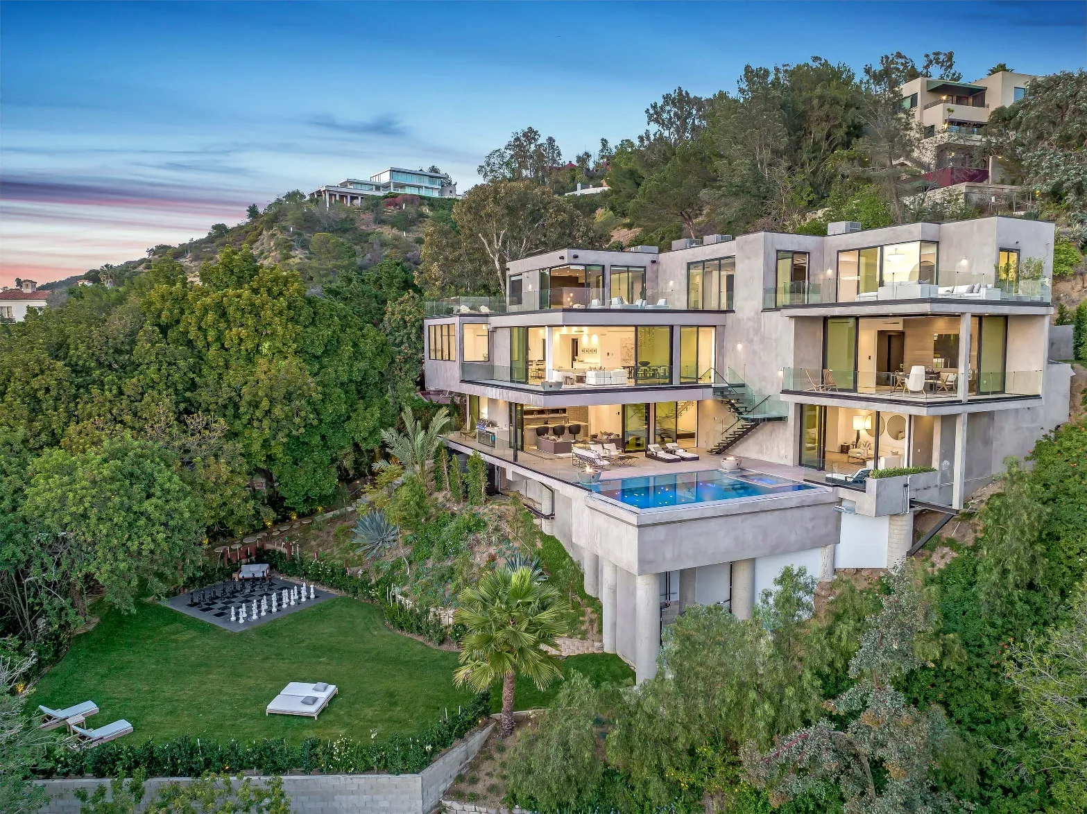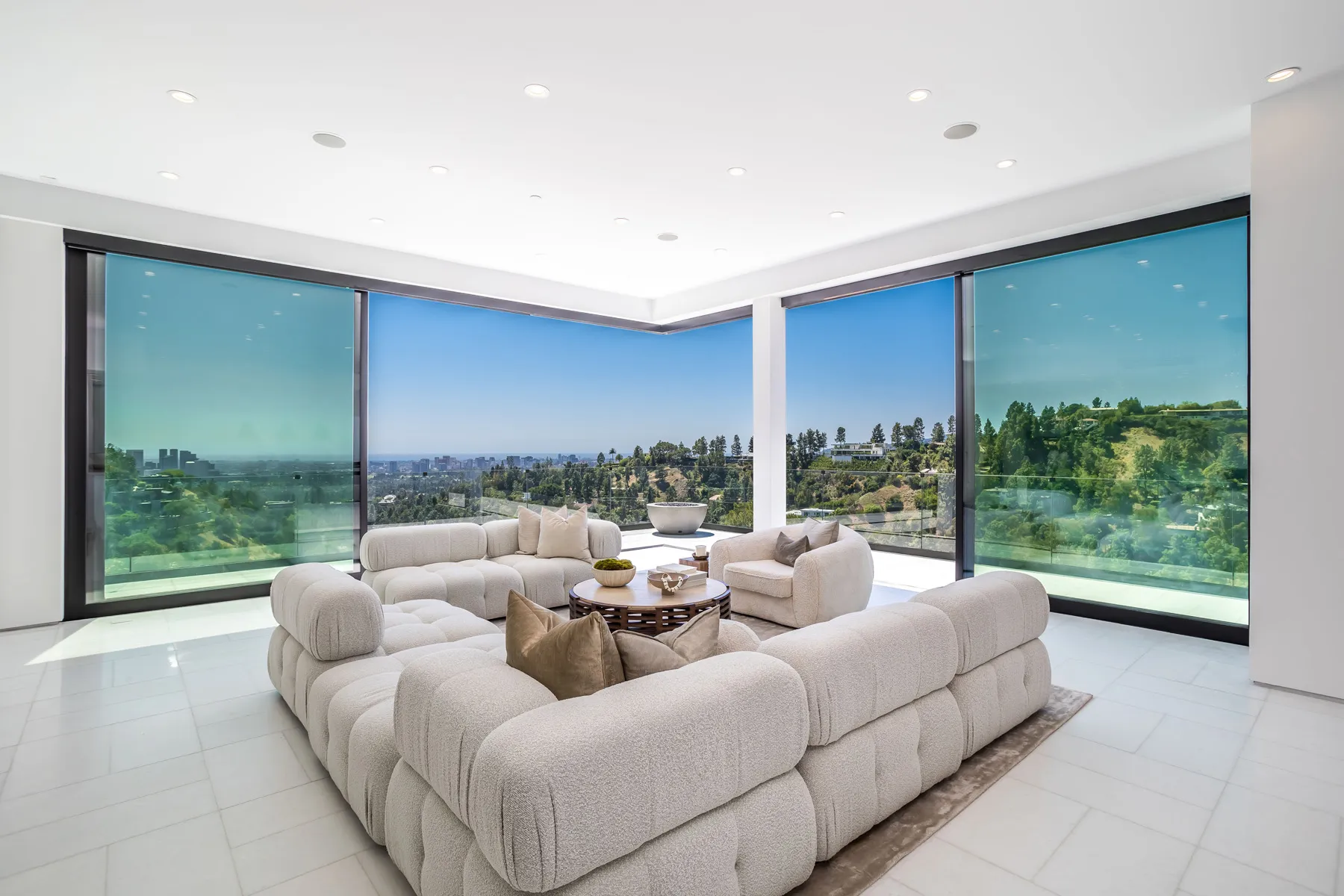 Located in the prestigious Crest Streets in Beverly Hills, this architectural masterpiece offers unobstructed jetliner views from every room. The new construction smart house features Venetian wall finishes throughout, imported stonework, floor-to-ceiling walls and doors of glass, and over 3,400 sq. ft. of outdoor terraces, creating an unprecedented living experience. The 2,000 sq. ft. primary suite boasts a private glam room, hair salon, 2 garden lounge sitting areas, dual walk-in closets, wet bar, and glass shoe display room. The gourmet kitchen comes replete with a butler kitchen and pantry area. The sophisticated living and dining area is accentuated with a fingerprint-secured Mezcal/Wine tasting room. The lower entertainment level offers a luxurious bar, spa and theatre experience, including a zero-edge pool, Himalayan salt sauna, Japanese soaking tub, private yoga studio/gym, Tonal fitness system, wet steam room, poolside cabana room, and 20 person theater with bar. The private lower grassy yard is surrounded by lush landscaping and includes a large entertainment game space.