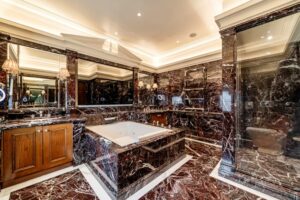 The principal bedroom suite occupies the entire second floor and includes a bedroom with a living area and marble fireplace, two walk-in dressing rooms and a lavish bathroom with a hydrotherapy bath and steam shower. The basement houses a spa with an indoor swimming pool lined with Italian marble, treatment rooms and an additional kitchen.